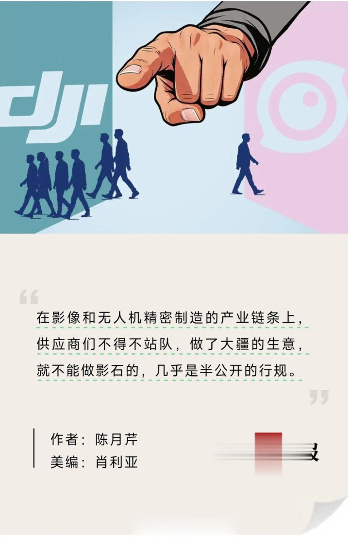 在影像和无人机精密制造的产业链条上,供应商们不得不站队,做了大疆的生意,就不能做影石的,几乎是半公开的行规。