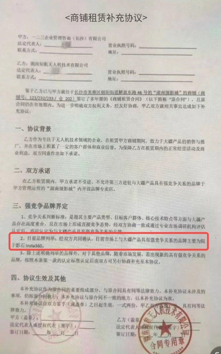 张均强从商场管理方获得的一份《商铺租赁补充协议》显示,商场管理方一二三企业管理咨询(长沙)有限公司承诺,在大疆经销商湖南知航无人机技术有限公司在门店租赁期内,“不引进、不允许第三方进驻与大疆产品具有强竞争关系的品牌于‘湖南摄影城’内开设品牌专卖店”。